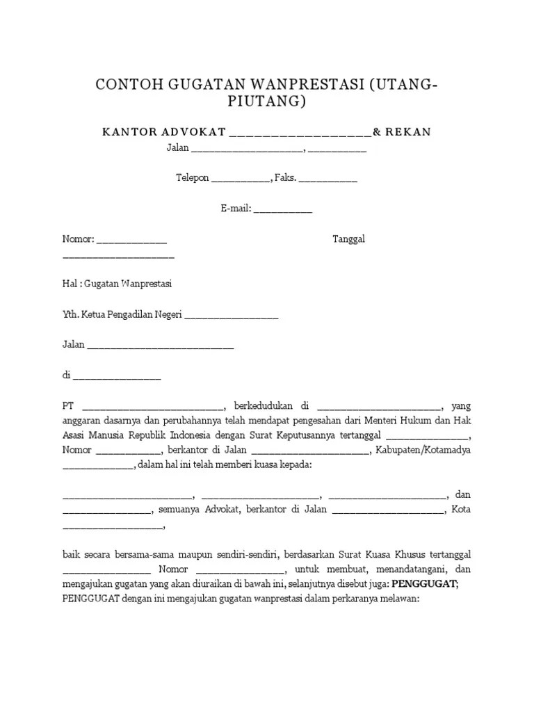 Kecamatan setia budi jakarta selatan berdasarkan surat kuasa khusus tanggal 25 maret 2015. Surat dan contoh surat gugatan wanprestasi hutang piutang pdf doc surat gugatan wanprestasi brenda isabella format 595 x 842 contoh surat gugatan wanprestasi format 768 x 1024 pixel download doc surat gugatan wanprestasi utang piutang ivan format 595 x 842 pixel download doc surat. Contoh surat gugatan perdata tentang sengketa jual beli hak dan gugatan wanprestasi surat gugatan perdata merupakan sebuah surat yang berisikan … Full pdf package download full pdf package. A short summary of this paper.